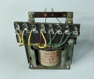 V20_20_6_6_R300 750 руб. Трансформатор Ш-образный отечественный с панелью, на которой нанесена информация по обмоткам. R1 = 300 Ом V2 = 23,3 v V3 = 23,3 v V4 = 6,6 v V5 = 6.6 v размеры - 68х60х55 мм масса - 0,7 кг