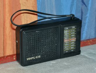 Радиоприёмник Кварц 408 работает в диапазонах ДВ и СВ. Питание осуществляется от батареи типа Крона.